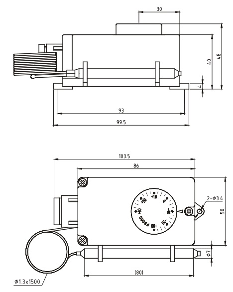 Термостат приспособлен для установки на стене или в воздуховоде в любом положении. Корпус крепится к плоскости с помощью крепежных винтов со стороны передней панели. Термобаллон помещается в среду с контроллируемой температурой. Термостат соединяется с термобаллоном капилляром длиной 1,5 м.