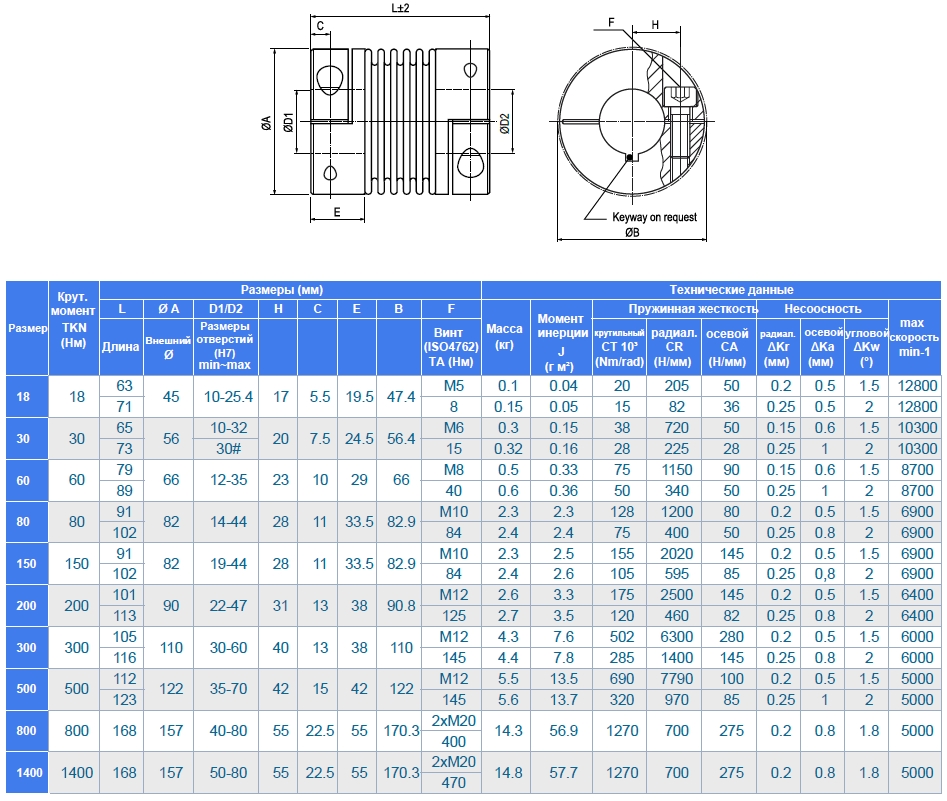 Муфты КВ4 - беззазорные металлические сильфонные муфты с зажимными ступицами, для легкой сборки/разборки. Распространенный вариант прецизионных муфт, которые точно передают крутящий момент при средней скорости вращения. Конструкция муфты КВ4/80 - из стали и с мембраной из высокоупругой нержавеющей стали во всех типоразмерах.