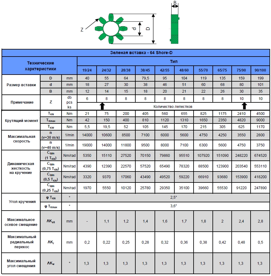Муфты предназначены для работы с достаточно большими нагрузками. Они передают крутящий момент через эластичный звездообразную вставку, находящуюся под давлением, которая поглощает удары и крутильные вибрации. Этот элемент маслостойкий, химически устойчивый, термостойкий и электропроводящий. Эластичные элементы доступны в разных цветах в зависимости от их твердости.