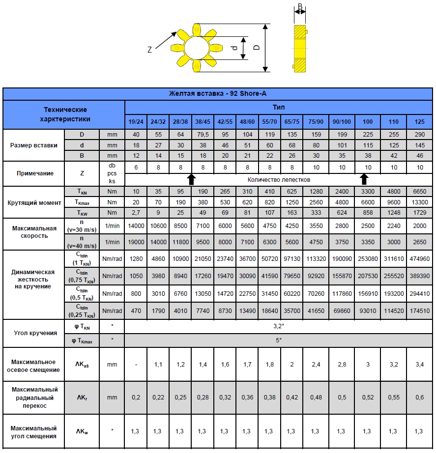 Муфты предназначены для работы с достаточно большими нагрузками. Они передают крутящий момент через эластичный звездообразную вставку, находящуюся под давлением, которая поглощает удары и крутильные вибрации. Этот элемент маслостойкий, химически устойчивый, термостойкий и электропроводящий. Эластичные элементы доступны в разных цветах в зависимости от их твердости.