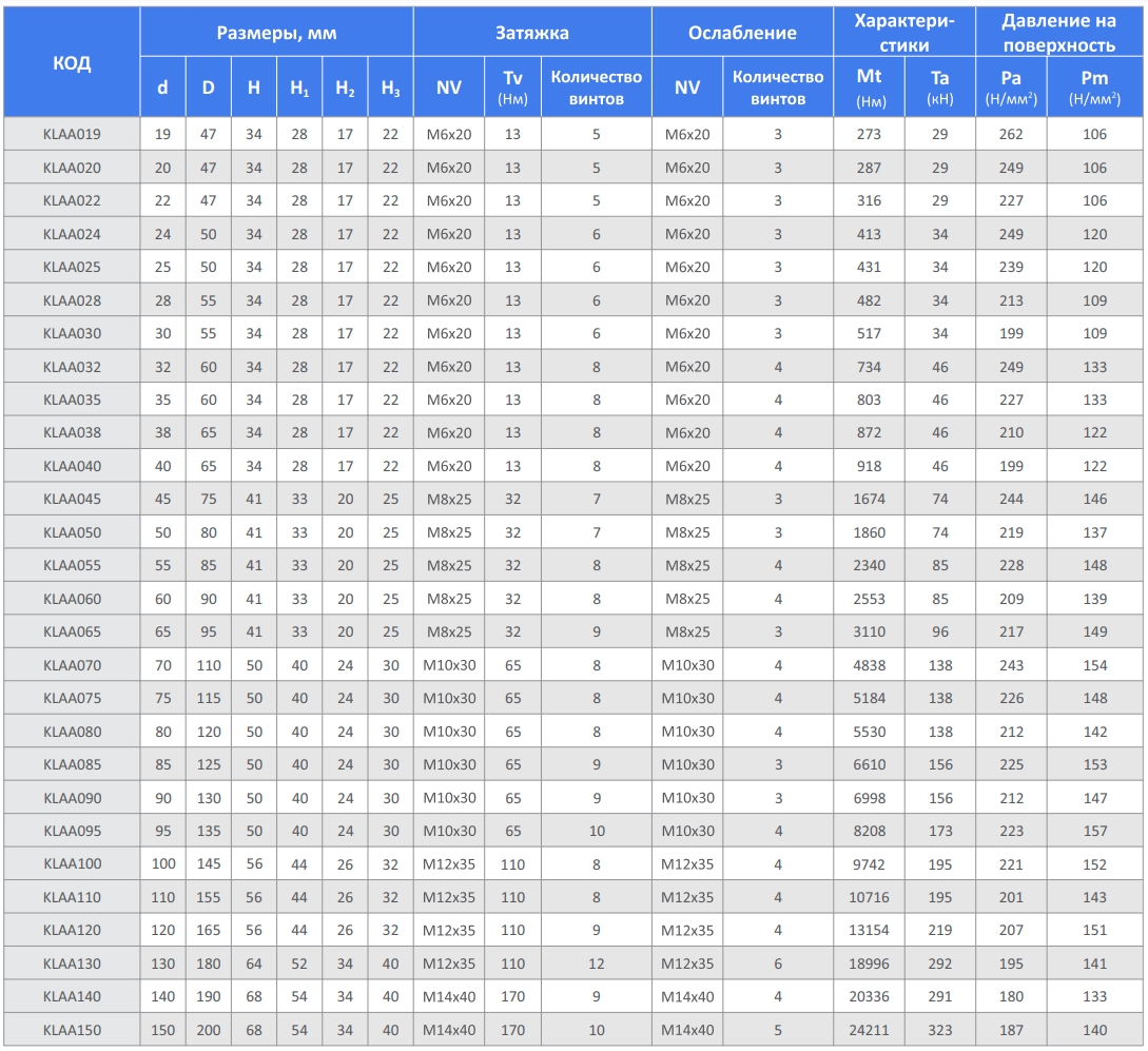 Зажим для валов KLAA (зажимной элемент, соединители валов) предназначен для соединения деталей и валов. Способен передавать высокий крутящий момент. Часто зажимы такого типа называют без шпоночным соединением. C помощью замка удобно крепить шкивы, звездочки, муфты, соединять валы.