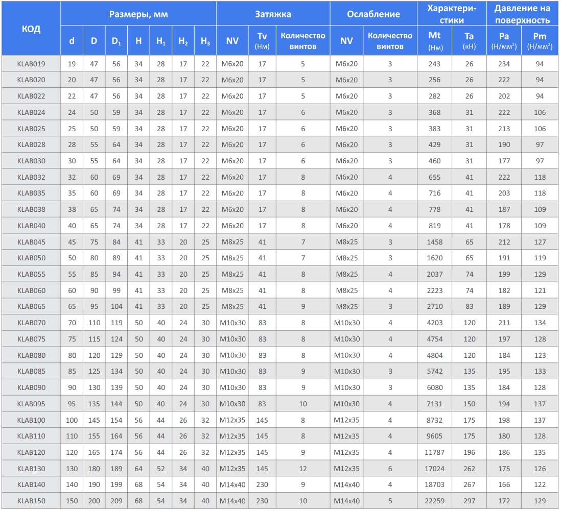 Зажим для валов KLAB (зажимной элемент, соединители валов) предназначен для соединения деталей и валов. Способен передавать высокий крутящий момент. Часто зажимы такого типа называют без шпоночным соединением. C помощью замка удобно крепить шкивы, звездочки, муфты, соединять валы.