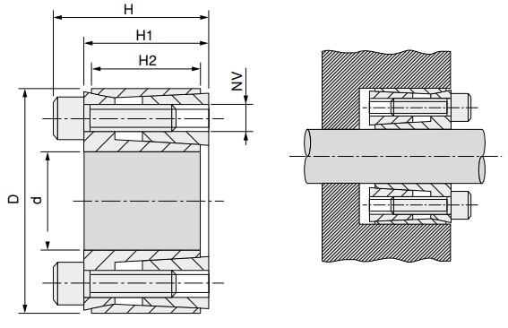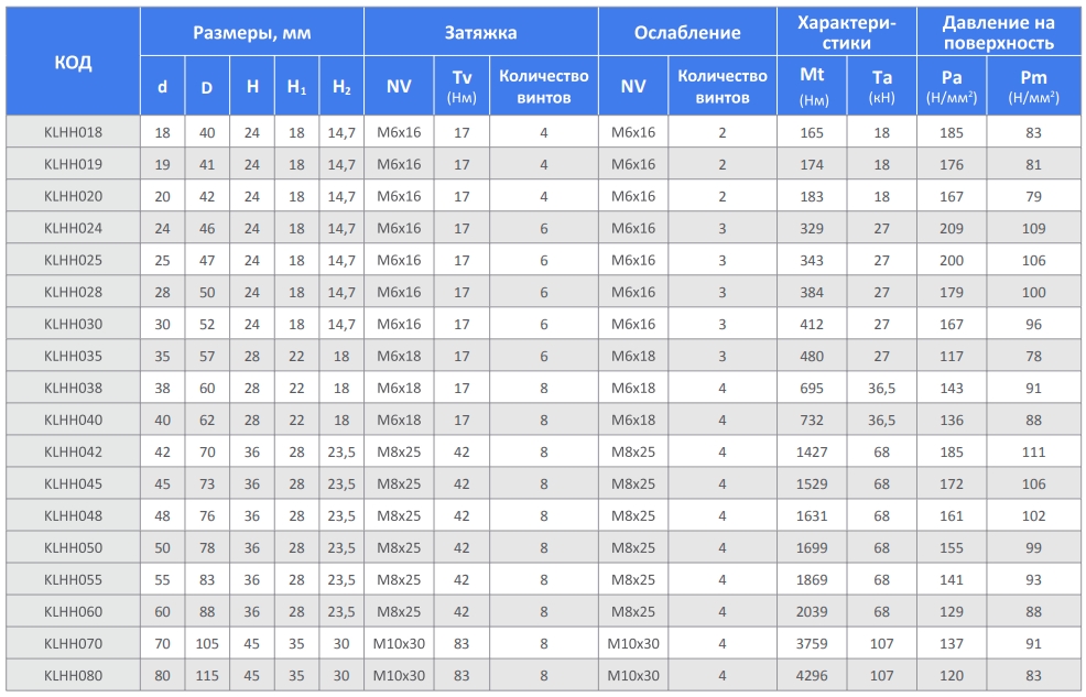 Зажим для валов KLHH (зажимной элемент, соединители валов) предназначен для соединения деталей и валов. Способен передавать высокий крутящий момент. Часто зажимы такого типа называют без шпоночным соединением. C помощью замка удобно крепить шкивы, звездочки, муфты, соединять валы.