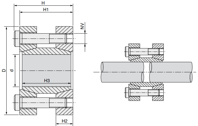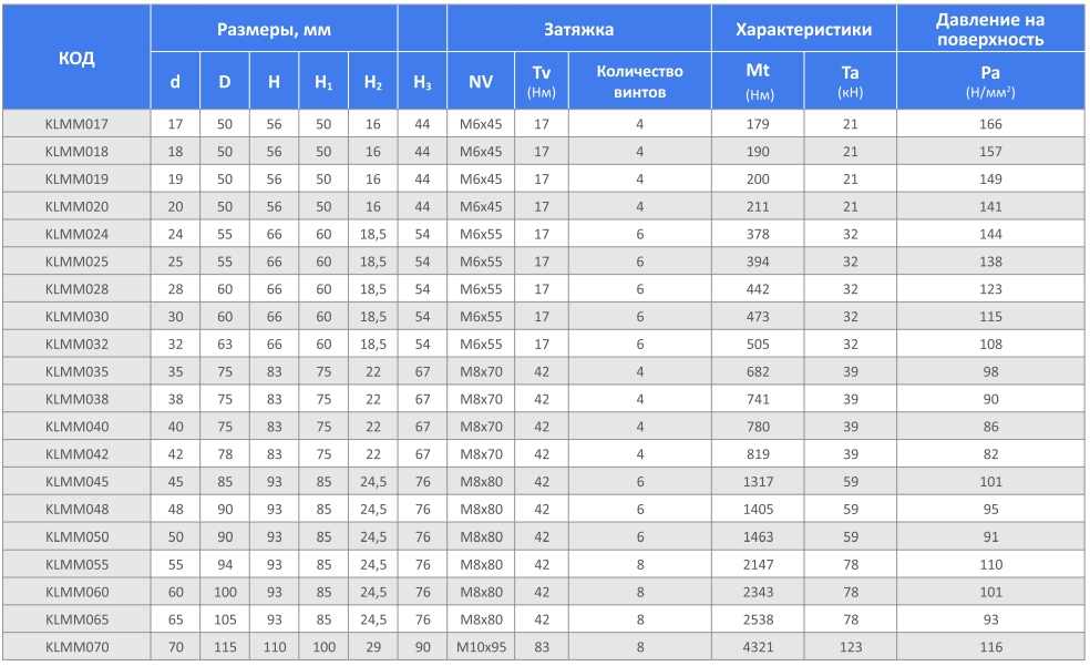Зажим для валов KLMM (зажимной элемент, соединители валов) предназначен для соединения деталей и валов. Способен передавать высокий крутящий момент. Часто зажимы такого типа называют без шпоночным соединением. C помощью замка удобно крепить шкивы, звездочки, муфты, соединять валы.