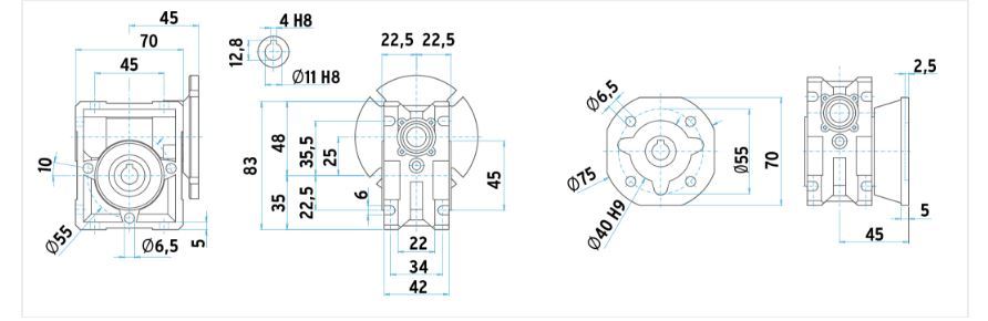 Благодаря универсальным присоединительным размерам редукторы CMRV служат заменой вышедших из строя червячных мотор-редукторов других фирм. Червячные мотор-редукторы CMRV могут комплектоваться выходными односторонними и двухсторонними валами, выходными фланцами и реактивными кронштейнами.