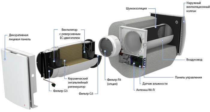 Рекуператор состоит из двух решеток, вентилятора, двух фильтров класса G3, телескопического канала и рекуператора. Устройство встраивается в стену комнаты, которая выходит наружу.