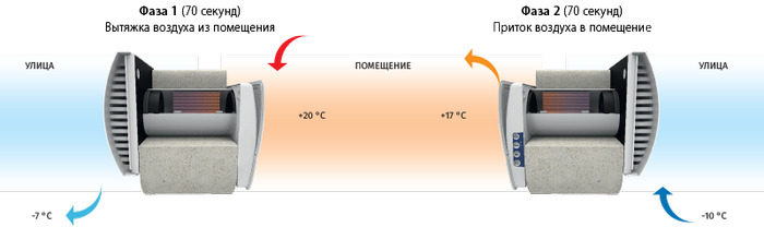 - Свежий холодный воздух с улицы проходит через регенератор, впитывая влагу и тепло, накопленные в рекуператоре. Когда регенератор остывает, установка снова переключается в режим вытяжки воздуха.
