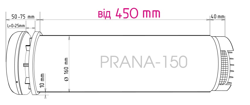 Рекуператор Прана 150 является прямоточной системой, напоминающий трубчатый канал, и напрямую монтируется в стену с выходом на улицу. Предусмотрена и система шумоизоляции за счет формы каналов, который снижает уровень шума в восемь раз.