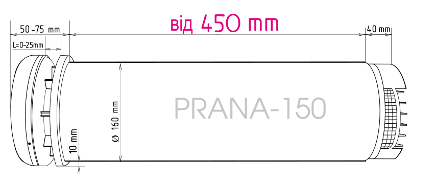 Рекуператор Прана 150 является прямоточной системой, напоминающий трубчатый канал, и напрямую монтируется в стену с выходом на улицу. Предусмотрена и система шумоизоляции за счет формы каналов, который снижает уровень шума в восемь раз.