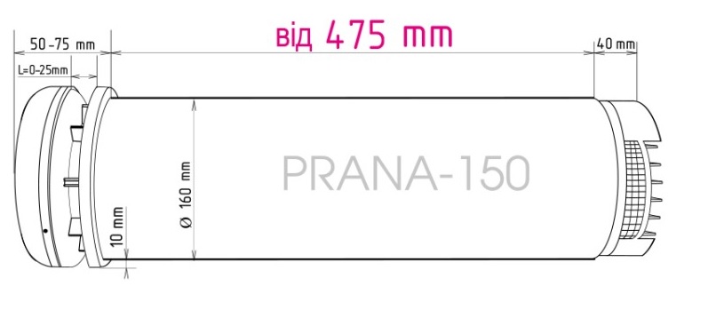 Рекуператор Прана 150 является прямоточной системой, напоминающий трубчатый канал, и напрямую монтируется в стену с выходом на улицу. Предусмотрена и система шумоизоляции за счет формы каналов, который снижает уровень шума в восемь раз.