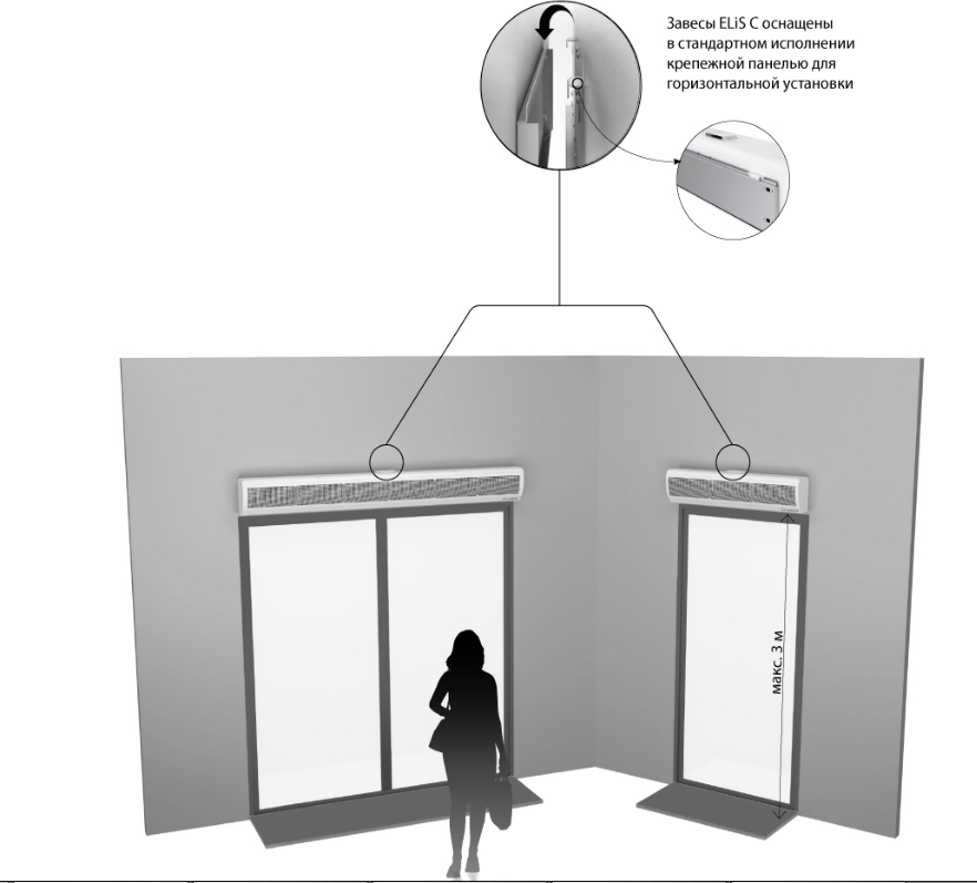 Завесы ELiS C предназначены для применения в общественных зданиях, таких как: магазины, спортивные залы, рестораны. Завесы ELiS C устанавливаются горизонтально над дверным проемом высотой макс. 3 м.