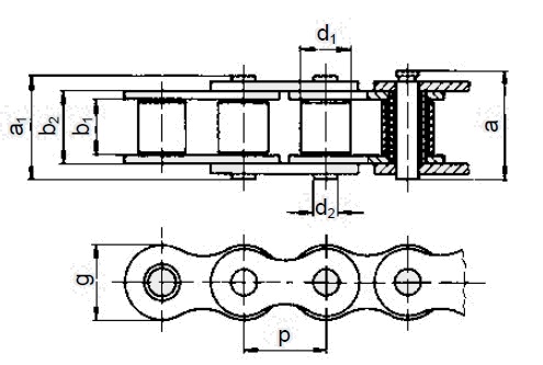 Приводная роликовая однорядная цепь предназначена для силовых механических передач в сельскохозяйственных машинах и механизмах, в частности зерноуборочных и кормоуборочных (фуражных) комбайнах, тракторах, жатках, пресс-подборщиках и т.д.