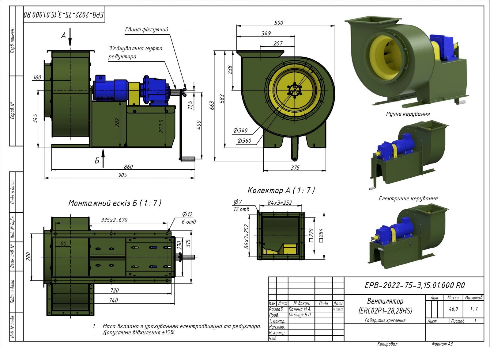 Габаритні розміри Електроручний вентилятор для бомбосховищ ЕРВ-2022-75-3,15