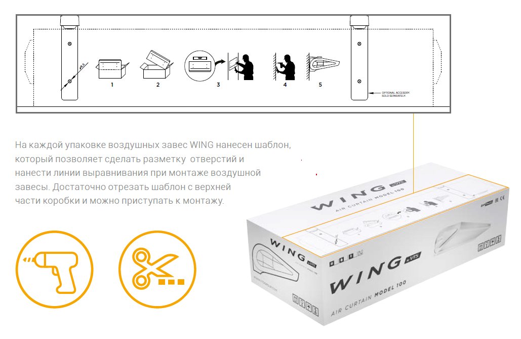 Повітряні завіси WING можуть бути встановлені в горизонтальному або вертикальному положенні *. Завдяки малій висоті корпусу і розташуванню решітки забору повітря під нахилом, завіса може бути встановлена в дуже обмеженому просторі над дверима, без шкоди для продуктивності.