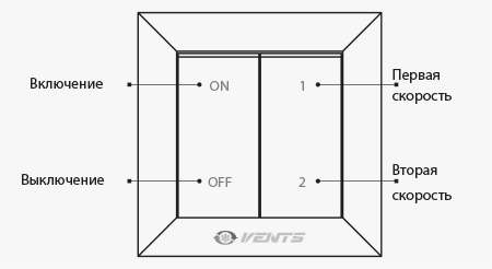 • Управління - включення /вимикання і перемикання швидкості двошвидкісного вентилятора здійснюється за допомогою клавіш перемикача.