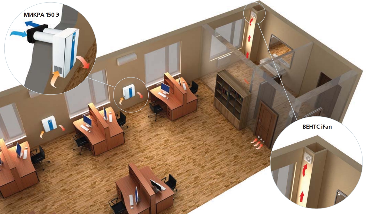 • У кожному приміщенні, що потребує вентиляції, встановлюється одна або кілька установок МІКРА 150 Е.