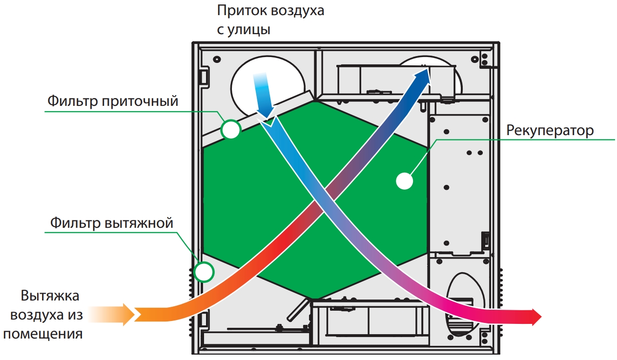 • У рекуператорі відбувається обмін теплової енергії теплого забрудненого повітря, що надходить із кімнати, та чистого холодного повітря, що надходить з вулиці.