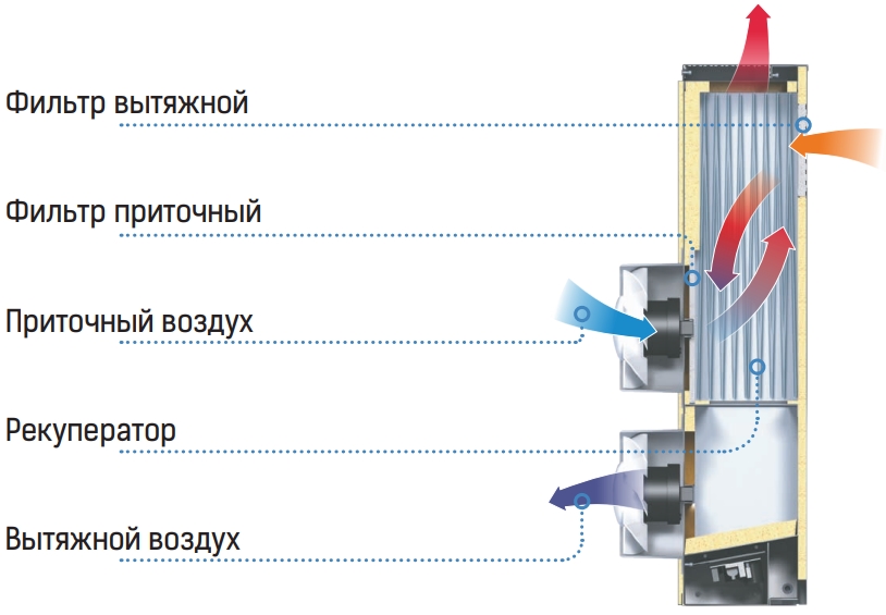 Потоки припливного та витяжного повітря не змішуються, завдяки чому виключається передача одним потоком іншому забруднень, запахів та мікробів.