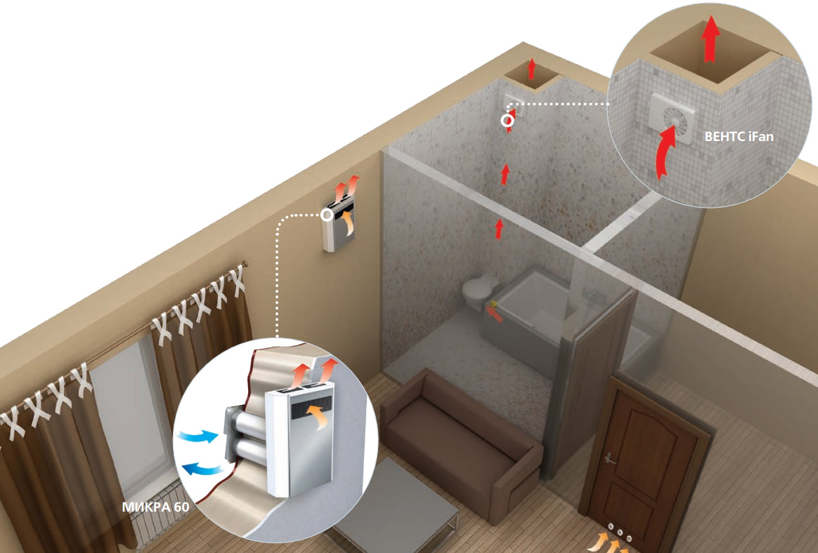 Для організації максимально енергоефективної вентиляції в будинку на базі установок МІКРА 60 рекомендується встановити інтелектуальні вентилятори ВЕНТС iFan у кухні та санвузлі, які здійснюють витяжку повітря автоматично зі спрацьовування датчиків руху та вологості.