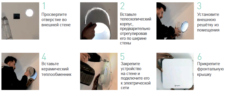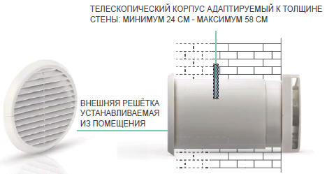 Вентиляційна установка серії ECOCOMFORT повинна встановлюватись на зовнішній стіні приміщення. Завдяки телескопічному корпусу, пристрій легко встановлюється в різні стіни, завтовшки: мin ширина 27 см, мах ширина 58 см. Якщо є потреба понад 58 см, у цьому випадку вирішить питання подовжувач з можливість встановлення до 1 метра.