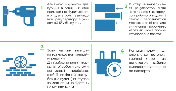 Для встановлення рекуператора потрібні послуги кваліфікованих фахівців для буріння отвору у зовнішній стіні будівлі, підключення електромережі, а також для налаштування режимів та інструктажу для подальшого обслуговування та експлуатації рекуператора.