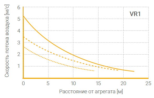 Maксимально дальність потоку повітря в вертикальному напрямку 8-15 м, в залежності від типорозміру агрегату. Максимальна дальність в горизонтальному напрямку становить 14-25 м.