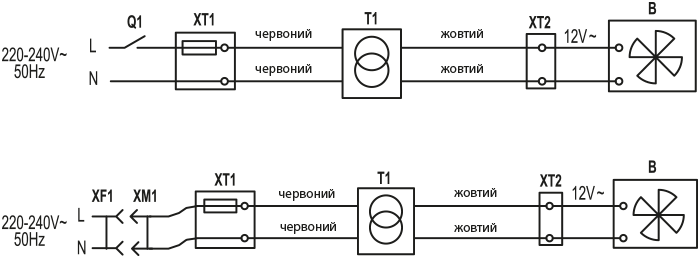 Вихідна клемна колодка використовується для підключення вентилятора із безпечною напругою живлення 12 В.