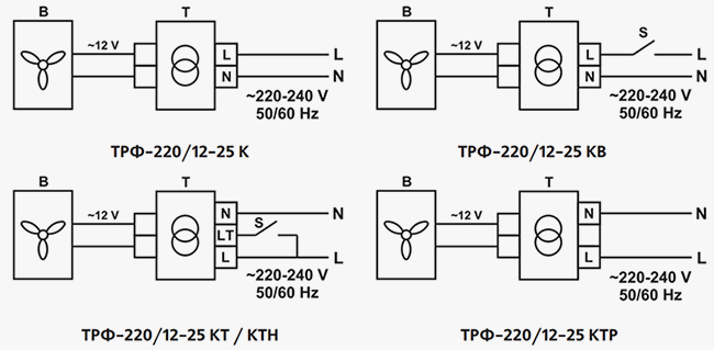 • ТРФ-220/12-25 КВ – трансформатор у пластиковому корпусі для настінного монтажу зі вбудованим вимикачем. Корпус облаштований лампою індикації роботи.