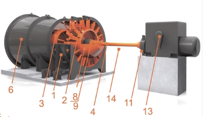 Підшипникові опори 8 і 9 ротора 4 розташовуються відповідно у втулці спрямляющего апарату корпусу 1 і в коку 2. Обертання робочого колеса здійснюється за допомогою електродвигуна 13 через муфту і трансмісійний вал 14. Передбачені модифікації вентиляторів додатково оснащуються протівосривнимі пристроями, стаціонарними вхідними напрямними апаратами (ВНА) або спеціальними ВНА з поворотними закрилками.
