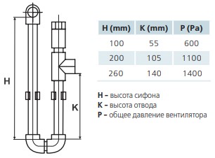 - Для відведення конденсату необхідно використовувати сифон. Висота сифона залежить від загального тиску вентилятора. Висоту сифона можна розрахувати за наведеним нижче малюнком та таблицею.