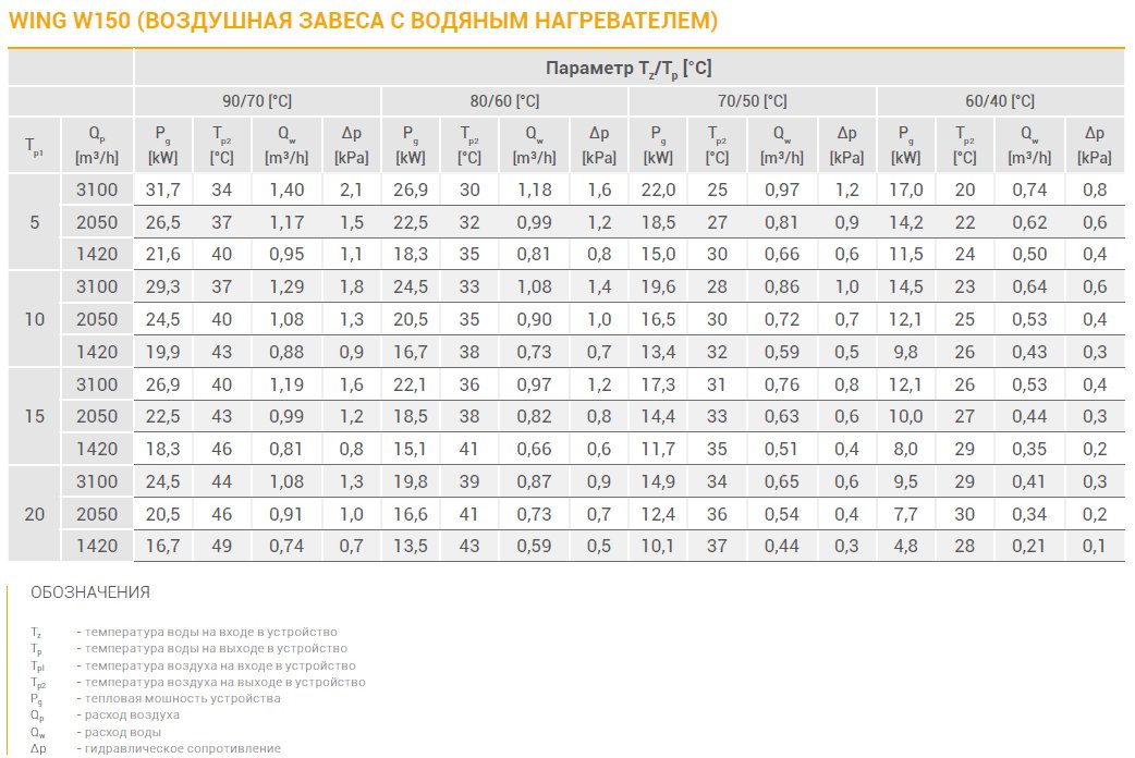 Параметри повітряної завіси VTS WING W150