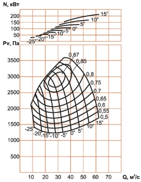 Регулирование вентилятора осуществляется изменением угла установки лопаток рабочего колеса (при остановленном вентиляторе) и закрылками направляющего аппарата (на ходу), а также частотно-регулируемым приводом;
