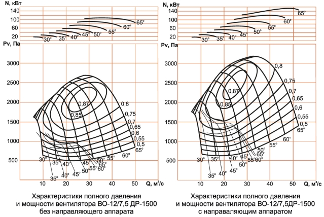 Аэродинамические характеристики вентилятора ВО-12/7,5ДР-1500
