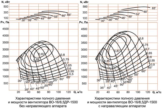 Аэродинамические характеристики вентилятора ВО-16/8,5ДР-1500