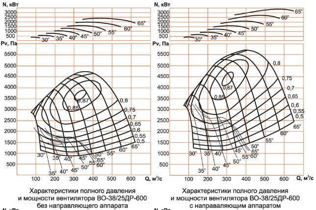 Аэродинамические характеристики вентилятора ВО-38/25ДР-600