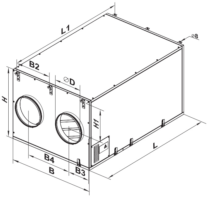 Приточно-вытяжная установка подвешивается к потолку. Установку можно разместить как во вспомогательных помещениях, так и в основных (за подвесным потолком, в нише или открытым способом). Монтировать можно только в таком положении, чтобы обеспечить сбор и отвод конденсата. Доступ для сервисного обслуживания и чистки фильтра со стороны боковой панели.
