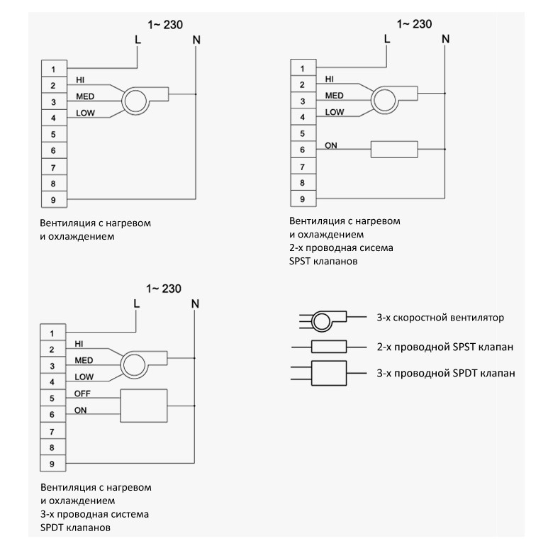 • Возможность использования для управления вентиляторами и клапанами фанкойлов, агрегатов воздушного отопления с трехскоростными вентиляторами 230 В.