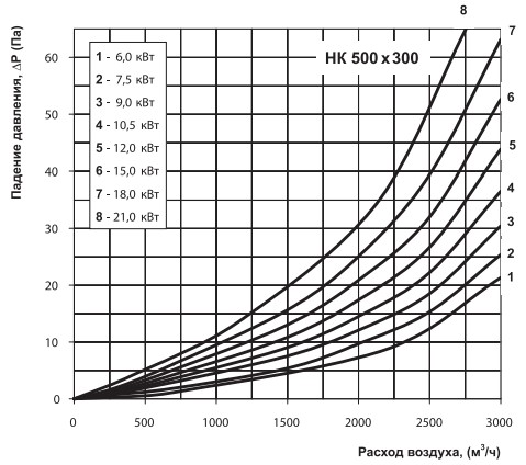 Аэродинамические характеристики Электрический нагреватель ВЕНТС НК 500x300-9,0-3