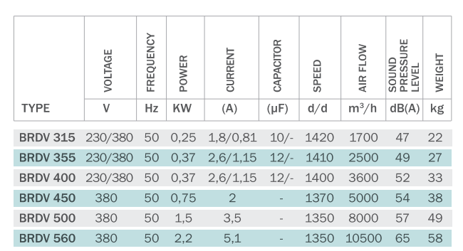 Крышные вентиляторы BRDV имеют крыльчатки с загнутыми назад лопатками, посаженные непосредственно на вал двигателя.