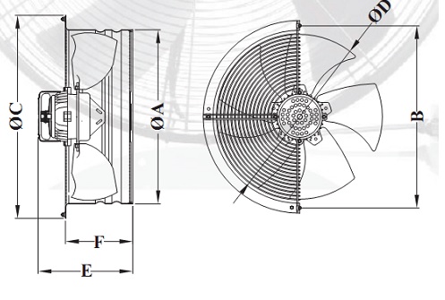Сетка и крыльчатка вентилятора изготовлены из стали, покрытой  эпоксидной порошковой краской, высокий уровень устойчивости к коррозии. Имеет высокую скорость вращения при небольшом уровне шума. Рабочий диапазон температур для двигателя -20°C +40°C. Вентилятор укомплектован однофазным асинхронным двигателем, в котором установлен многоразовый термопредохранитель, срабатывающий при температуре +95°C.