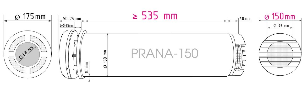 Рекуператор Прана 150 является прямоточной системой, напоминающий трубчатый канал, и напрямую монтируется в стену с выходом на улицу. Предусмотрена и система шумоизоляции за счет формы каналов, который снижает уровень шума в восемь раз.