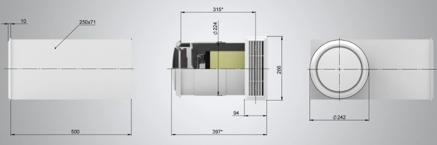 Конструкция рекуператора предусматривает вывод воздуховода в толщу теплоизоляционного слоя стены, что позволяет скрыть воздушную решетку в откосе окна. Что получаем в результате: эффективная вентиляция и вывод избытка влаги, а также защита от плесени в здании с не видимыми снаружи крышками воздуховода.