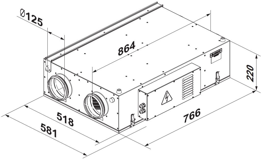 Установка предназначена для подвесного потолочного монтажа и может устанавливаться на балконе, в кладовой, подвале, чердаке и в других вспомогательных помещениях. Установка может также монтироваться в основных помещениях непосредственно к потолку, за подвесным потолком или устанавливаться в потолочную нишу. Доступ для сервисного обслуживания со стороны нижней панели.