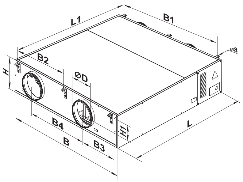 Приточно-вытяжная установка подвешивается к потолку. Установку можно разместить как во вспомогательных помещениях, так и в основных (за подвесным потолком, в нише или открытым способом). Монтировать можно только в таком положении, чтобы обеспечить сбор и отвод конденсата. Доступ для сервисного обслуживания и чистки фильтра со стороны боковой панели.