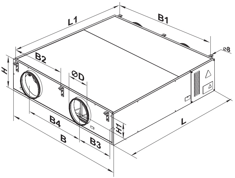 Приточно-вытяжная установка подвешивается к потолку. Установку можно разместить как во вспомогательных помещениях, так и в основных (за подвесным потолком, в нише или открытым способом). Монтировать можно только в таком положении, чтобы обеспечить сбор и отвод конденсата. Доступ для сервисного обслуживания и чистки фильтра со стороны боковой панели.