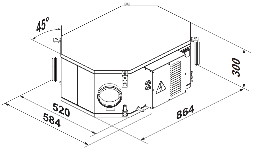 Установка предназначена для подвесного потолочного монтажа и может устанавливаться на балконе, в кладовой, подвале, чердаке и в других вспомогательных помещениях. Установка может также монтироваться в основных помещениях непосредственно к потолку, за подвесным потолком или устанавливаться в потолочную нишу. Доступ для сервисного обслуживания со стороны нижней панели.