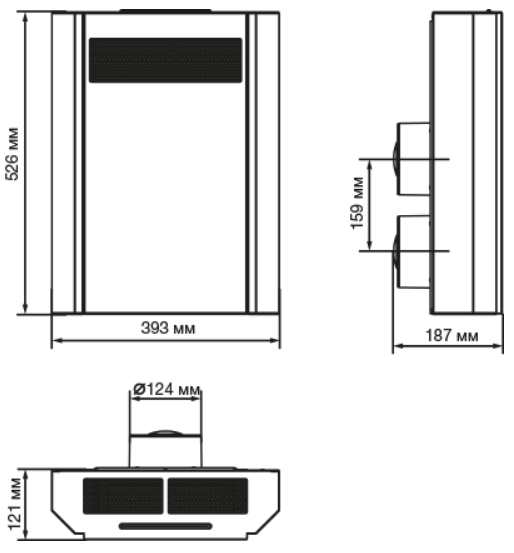 • Подача наружного воздуха в установку и удаление отработанного воздуха из помещения осуществляются через два канала диаметром 125 мм.