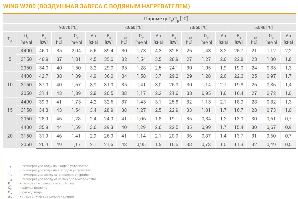 Параметры воздушной завесы VTS WING W200